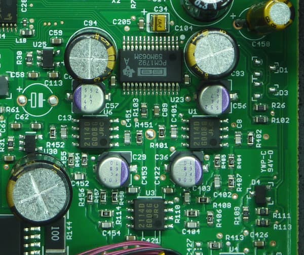 Микросхема цифро-аналогового преобразователя — PCM1792A (это топовый чип Texas Instruments). В обвязке ЦАПа используются известные операционные усилители JRC2114. SMD-исполнение несколько омрачит энтузиазм любителей замены операционников.