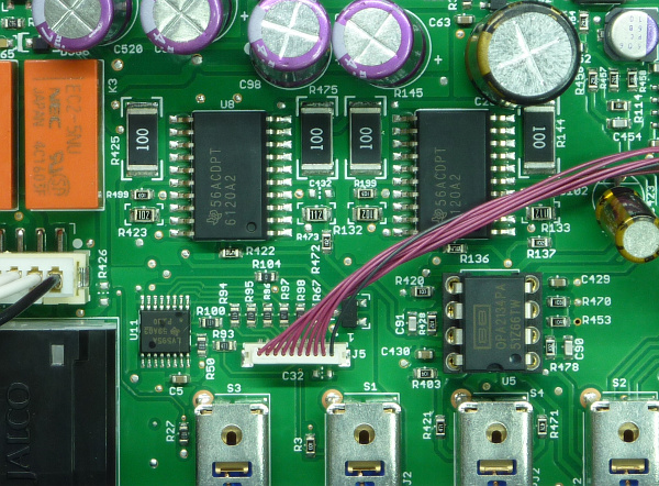Наушниковый усилитель реализован на специализированных микросхемах TPA6120 и имеет полноценный балансный выход. Неподалеку, в панельке с возможностью замены, можно увидеть микросхему OPA2134, которая, скорее всего, является выходным буфером линейного выхода RCA.