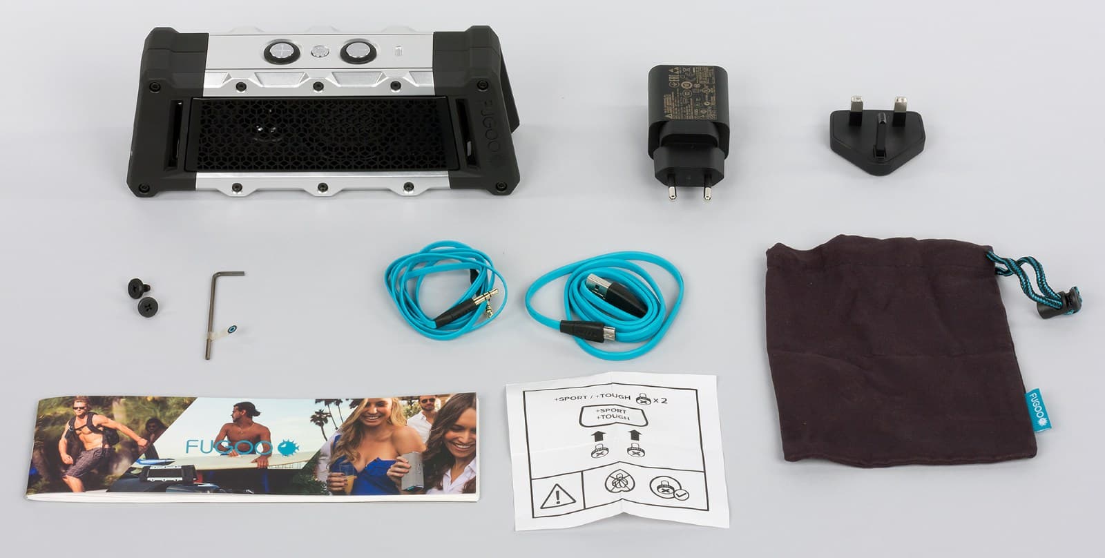 Упаковывается Fugoo в симпатичную, «витринную» коробку. Такие обычно используются для имиджевых устройств и не особо распространены в мобильной технике. В данном случае решение, конечно, выигрышное: оригинальный дизайн Fugoo Tough сразу бросается в глаза.