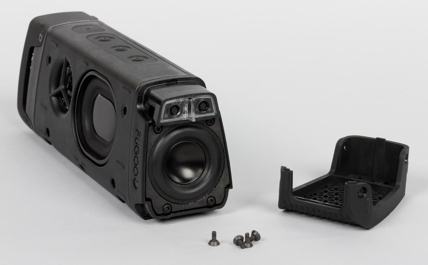 Снизу находится крепление для фирменных аксессуаров, с помощью которых можно установить Fugoo Tough в самых разных местах. Теперь разберем устройство, чтобы взглянуть на саму акустическую систему, именуемую Fugoo Core.