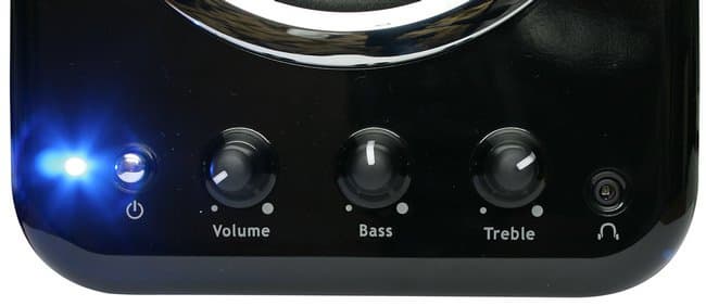 На передней панели расположены: кнопка выключения с индикатором питания; регулятор общей громкости, уровня высоких и низких частот; а также разъем миниджек для подключения наушников. Очень важно, что все регуляторы размещены на передней панели.