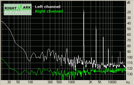 Для наглядности мы приводим скриншот полученного спектра сигнала, при подаче синусоидального сигнала частотой 2 кГц. На приведенных спектрограммах мы можем отчетливо видеть вклад в общее звучание паразитных гармоник.