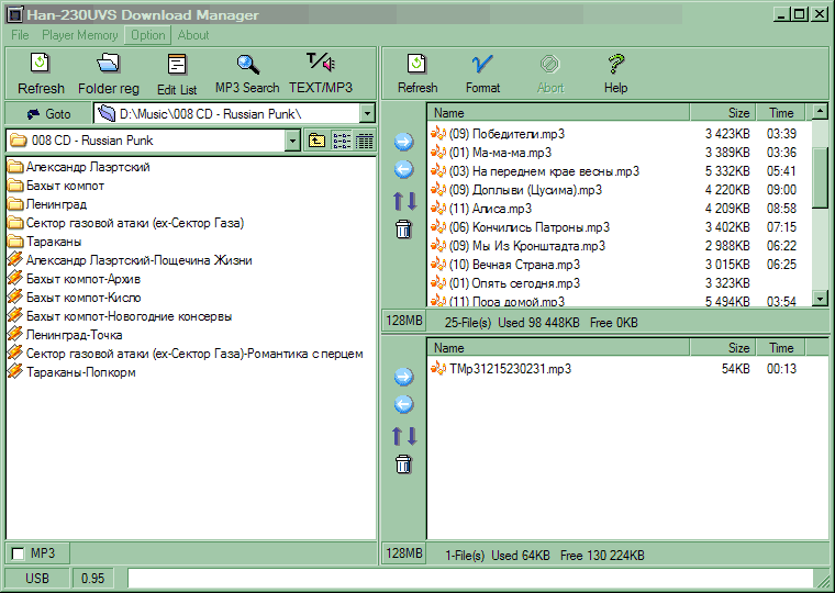 Перед вами основное окно Download Manager В принципе, программа похожа на аналоги по основным функциям, но несколько отличается от них в плане реализации. Так, работа со встроенной памятью и картой расширения происходит одновременно, что достаточно удобно. Прямо в главном окне можно быстро переписать файлы с компьютера или обратно (никакой «антипиратской» защиты нет — МР3-файлы можно переносить свободно), отсортировать их в памяти плеера или на карте или удалить вообще. Левое окно предназначено для навигации по файловой системе на компьютере. Есть строка для быстрого перехода по каталогам, а так же нечто типа «Избранного». Имеется возможность фильтрации файлов — если вы не планируете использовать плеер как носитель данных, можно пометить соответствующий чекбокс, после чего в левом окне будут отображаться лишь МР3-файлы. Можно просто выделять файлы и копировать их, но есть способ и лучше.