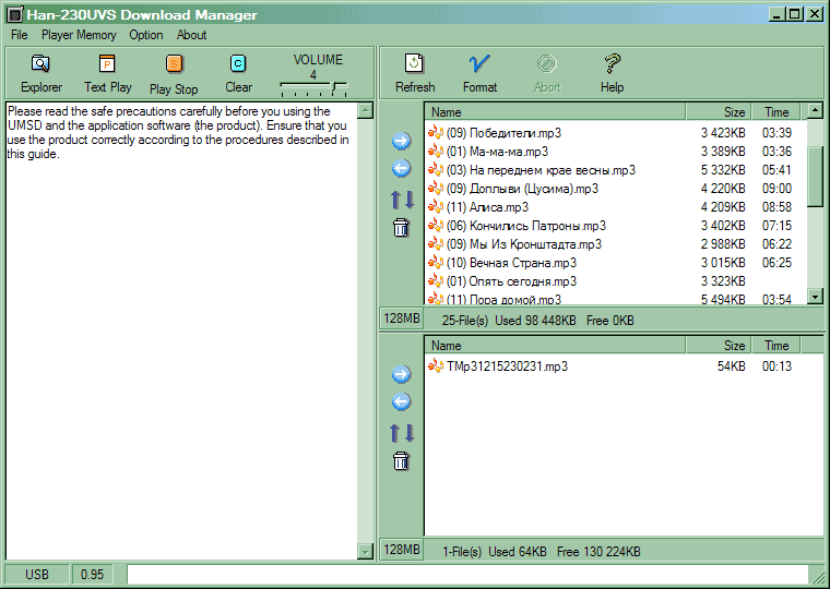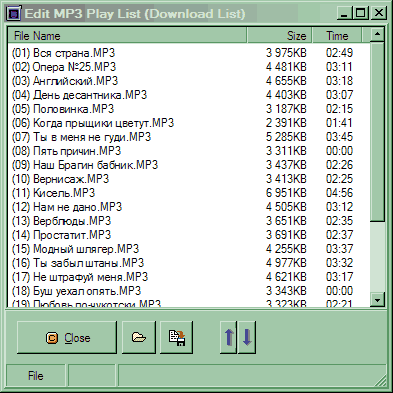 Такое окошко появляется при нажатии кнопки «Edit List». Вместо того, чтобы перемещаться по каталогам в главном окне, переписывая их на плеер «малыми дозами», можно просто открыть данное окно, при помощи кнопки «Open» в нем добавить в список файлы (можно даже из разных каталогов), упорядочить их как угодно и… Нет, не сразу записать в память, а сохранить в виде плейлиста в формате M3U. Зачем это нужно? Дело в том, что плеер умеет работать с этими файлами, так что, создав плейлист, его содержимое можно легко сбросить в память целиком, не совершая ненужных движений. Разумеется, для создании плейлиста можно пользоваться не только встроенным редактором, но и любыми другими программами. Есть только одна тонкость — на момент тестирования поддерживались только «простые» M3U-файлы — расширенная информация (которую любит записывать, например, Winamp) приводила к тому, что плейлист не мог быть корректно обработан. Впрочем, возможно, что это уже исправили (или исправят в ближайшее время).