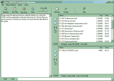 HAN-230UVS работает только с МР3-файлами — никаких архитектурных излишеств. Впрочем, считать это существенным недостатком я не могу — несмотря на давление со стороны Microsoft, успехи WMA на ниве сжатого звука не заметны абсолютно. Можно, конечно, сказать, что до появления версии V9 WMA технически отставал от МР3, однако… Большинство файлов в сети закодировано с битрейтом до 192 Кбит/с, что вполне по силам V7 и V8. Но при этом во всех архивах только МР3, пиратские и полупиратские сборники выходят только в виде МР3, да и сами пользователи предпочитают использовать именно МР3. Так что на сегодняшний день хватит и поддержки МР3. Хотел было сказать, что ситуация может быть и изменится через год-другой, да сообразил, что повторяю это почти три года :) Ну а про «успехи» других форматов и говорить не приходится — их и на фоне-то WMA не заметно… о конкуренции с МР3 и речи быть не может.