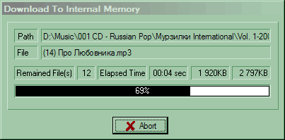 Вот такое вот окошко появляется при передаче файла (независимо от того, куда и откуда — лишь заголовок окна меняется). Все достаточно понятно. Мне даже кажется, что информация в нем явно избыточна. Как я уже упоминал, все файлы (и музыкальные тоже) можно без каких-либо сложностей переписывать в любом направлении. Скорость передачи данных весьма высока — 5.6 Мбит/с. Это не рекорд, но заметно больше, чем может обеспечить подавляющее большинство плееров.