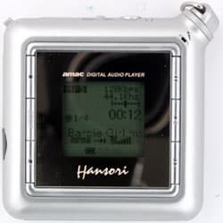 Плеер квадратный, что роднит его с MPIO DMG и DME. Впрочем, HAN меньше их обоих — 60 × 60 × 15 мм. Да и легче он заметно — 43 грамма без элемента питания, в то время как масса обоих MPIO в том же виде равна почти 60 граммам. С установленной батарейкой разница еще больше увеличивается: Hansori использует батарейку типа ААА, которая весит лишь 12-13 граммов, против 25 у применяемых конкурентами АА. Фактически размеры и масса немного лучше, чем у старой модели amac трехлетней давности — Hansori HAN-14XS: 60 × 60 × 16 мм 50 г. Причем «старичок» представлял собой примитивный МР3-плеер с LPT-интерфейсом, а новинка превосходит его по всем параметрам (отличная иллюстрация прогресса в данной области). Кстати, для сравнения — относящийся ранее к компактным iRiver iFP-180T имеет размеры 31 × 28 × 82 мм (т.е. в два раза уже, но в те же два раза толще, и заметно длиннее) при массе без элемента питания 49 граммов (за счет использования элемента АА снаряженная масса достигает 75 граммов, хоть в руководстве и написано ошибочно про 52 г.). В пору iRiver из рядов компактных плееров выкидывать. Ведь не добавлять туда Hansori — он хоть и маленький, зато поддерживает расширение памяти, причем недорогими картами типа SmartMedia емкостью до 128 Мбайт. Причем поддержка карт расширения памяти полная — эта модель является одной из немногих, которые способны записывать полученные с диктофона или с радио файлы на карту. Да, диктофон и радио тоже имеются, причем запись с радио возможна. Запись осуществляется в формате МР3, а не ADPCM. Единственное, чего плееру не хватает — линейного входа: в этом случае можно было бы говорить даже о конкуренции с MPIO DMB Plus.