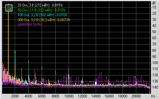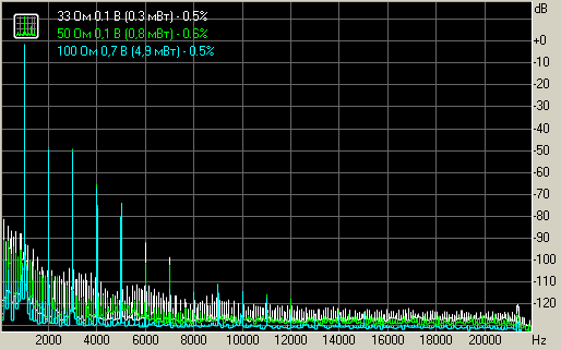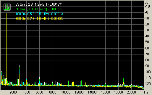 Из-за низкого выходного сигнала (и соответственно невысокого соотношения сигнал/шум) нельзя рассмотреть гармоники. Можно лишь сказать, что если они и есть, то весьма незначительного уровня на всех нагрузках.