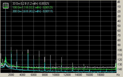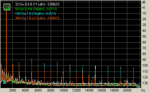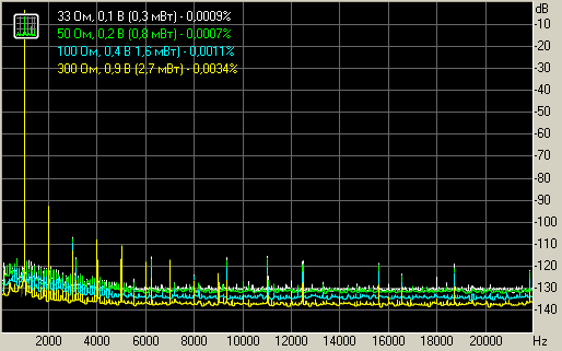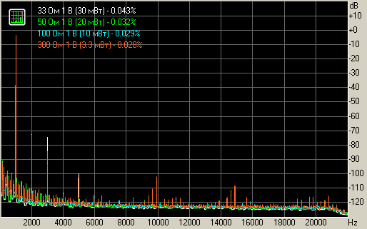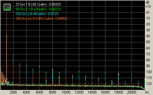 Уровень искажений при 1 В на нагрузках 33, 50, 100 и 300 Ом