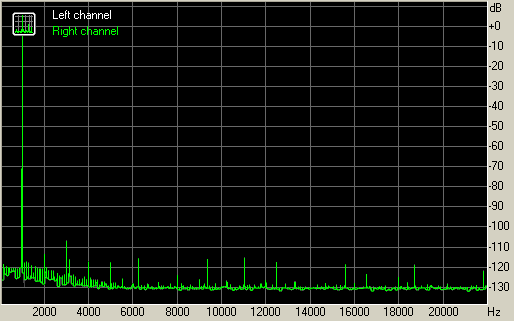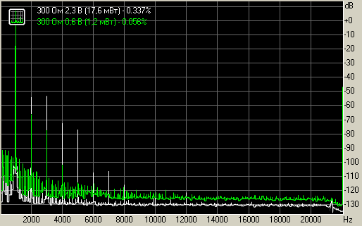 При выходном уровне в 1 В можно наблюдать лишь гармоники низших порядков, вторую, третью и пятую. Зависимость от нагрузки выражается в основном лишь на третьей гармонике. На высоких частотах видны лишние гармоники, однако это просто наводки. При увеличении громкости искажения нарастают плавно. Спектр говорит от о высоком качестве сигнала.