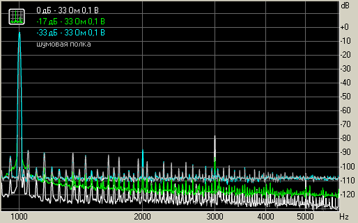 Уровень искажений для максимальной мощности на нагрузке 33 Ом, 0,3мВт