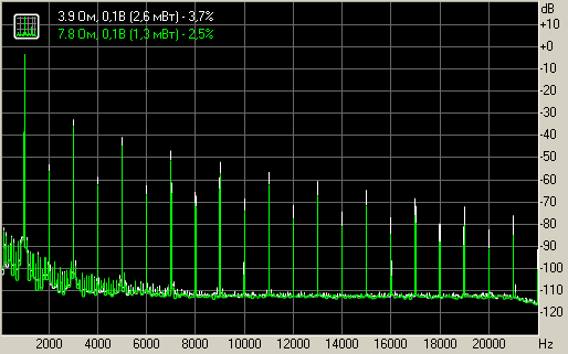 Зависимость искажений от нагрузки в 3,9 и 7,8 Ом для выхода на АС для 0,1 В