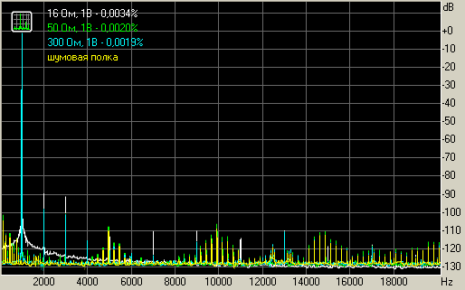 Уровень искажений при 1 В на нагрузках 16, 50, и 300 Ом