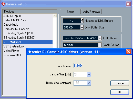 При инициализации устройства Hercules DJ Console ASIO в программе Cubase SX проект автоматически переходит в режим частоты семплирования 48 кГц, вне зависимости от того, в каком режиме проект был до этого.
