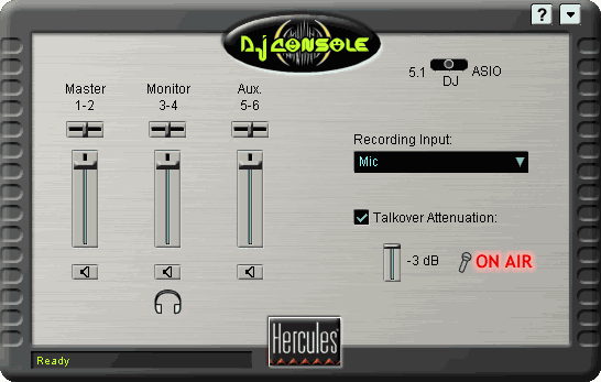 В режиме «DJ» в левой части появляются три других регулятора уровня громкости: Master, Monitor и Aux. Сигнал на миниджек и RCA выходах дублируется. Регулировка уровней громкости осуществляется во всех трех режимах одновременно. Здесь же находится галочка «Talkover Attenuation». При включении на пульте кнопки микрофона и этой галочки общий уровень громкости понижается на -3 дБ, -6 дБ и -9 дБ по выбору.