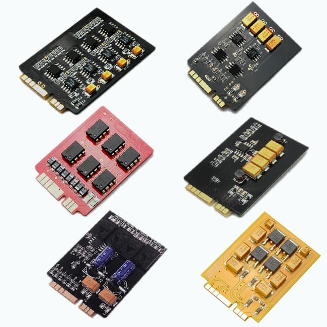 Среди платок усилителей есть модель с приставкой IEM — специально для внутриканальных наушников. Есть балансная, с большим размахом напряжения для высокоимпедансных низкочувствительных наушников. Есть полностью дискретная схема, без ОУ (желтая плата). Есть «музыкальная», с измененным характером звучания (черная плата слева вверху). Есть универсальная, относительно недорогая (слева внизу). Всего количество официальных платок уже дошло до 7. При покупке плеера стоит уточнить комплектацию.