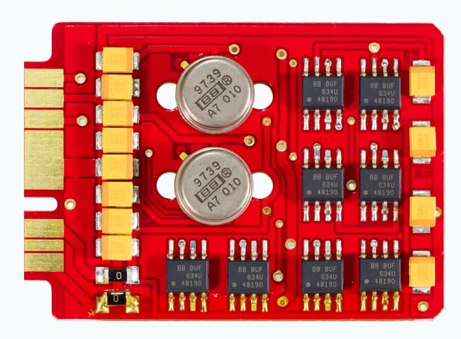 В нашем случае плеер комплектовался дорогой платой Hifiman Minibox Gold. Она основана на двух ОУ OPA637SM и восьми токовых буферах BUF634U. Металлический кожух ОУ OPA637SM создан для авиационной и военной промышленности, он дает температурную стабильность и защиту от электромагнитных наводок. Именно поэтому плата называется Gold, в отличие от предыдущей обычной красной платы Minibox. Плата универсальная, подходит и для низкоомных, и для высокоомных наушников.