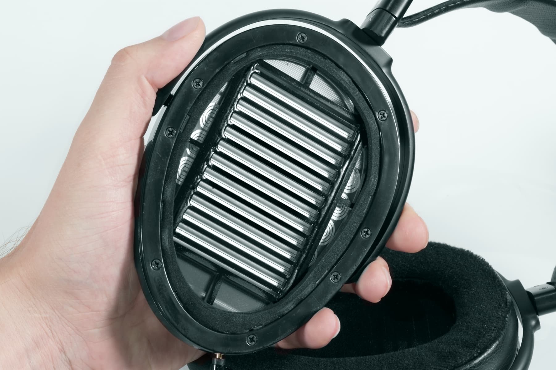 Магнитная система — двусторонняя. На фотографии показана внутренняя сторона при снятом амбушюре. Здесь же видно, что мембрана излучателя с нанесенной катушкой действительно занимает все габариты чашки наушников. Это не случай Sennheiser, где 37-миллиметровый излучатель стоит в огромной чашке. Культ HD580/HD600/HD650 длится десятилетиями и способен утомить даже владельца таких наушников.