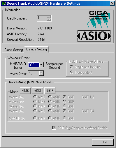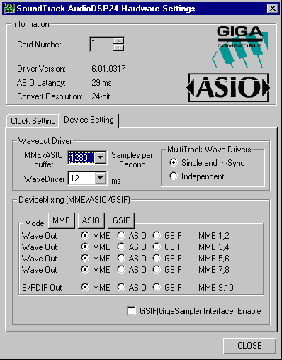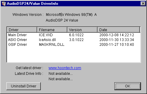 На данный момент ситуация с новыми операционными системами W2K/XP для многих профессиональных карт весьма печальная. WDM-драйвера часто представляют собой продукт с ущербной функциональностью, а также находятся в перманентном beta-тестировании. Не стала исключением и карта Hoontech DSP24 Value. Драйвера v7.1.0928 Beta5 (11/07/01) под W2K SP2 на момент тестирования были лишены мультиклиентности и совместимости с GSIF (семплер GigaStudio версии 2.5 не находил GSIF-совместимого устройства и не запускался, выдавая ERROR 60000).