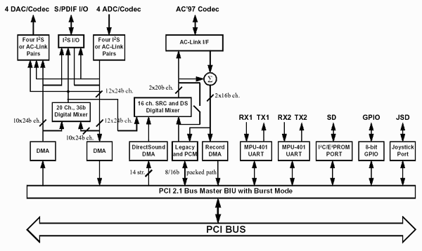 Из схемы видно, что данный чип обеспечивает управление шиной PCI в режиме DMA, а также независимую поддержку операций с каналами, идущими шины на I2S и AC'97. В части профессиональных интерфейсов имеется 20 каналов до 24 бит с аппаратным микшированием в 36-битной сетке. Перевожу на человеческий. Это позволяет реализовать мультиклиентные драйвера на 5 стерео входов и 5 стерео выходов. Результат без всяких конвертаций может мониториться на цифровом выходе либо выводиться только на него независимо от других каналов.