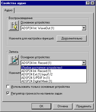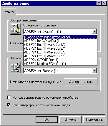 После установки драйверов под W98SE в свойствах аудио появляется множество устройств на запись и воспроизведение: