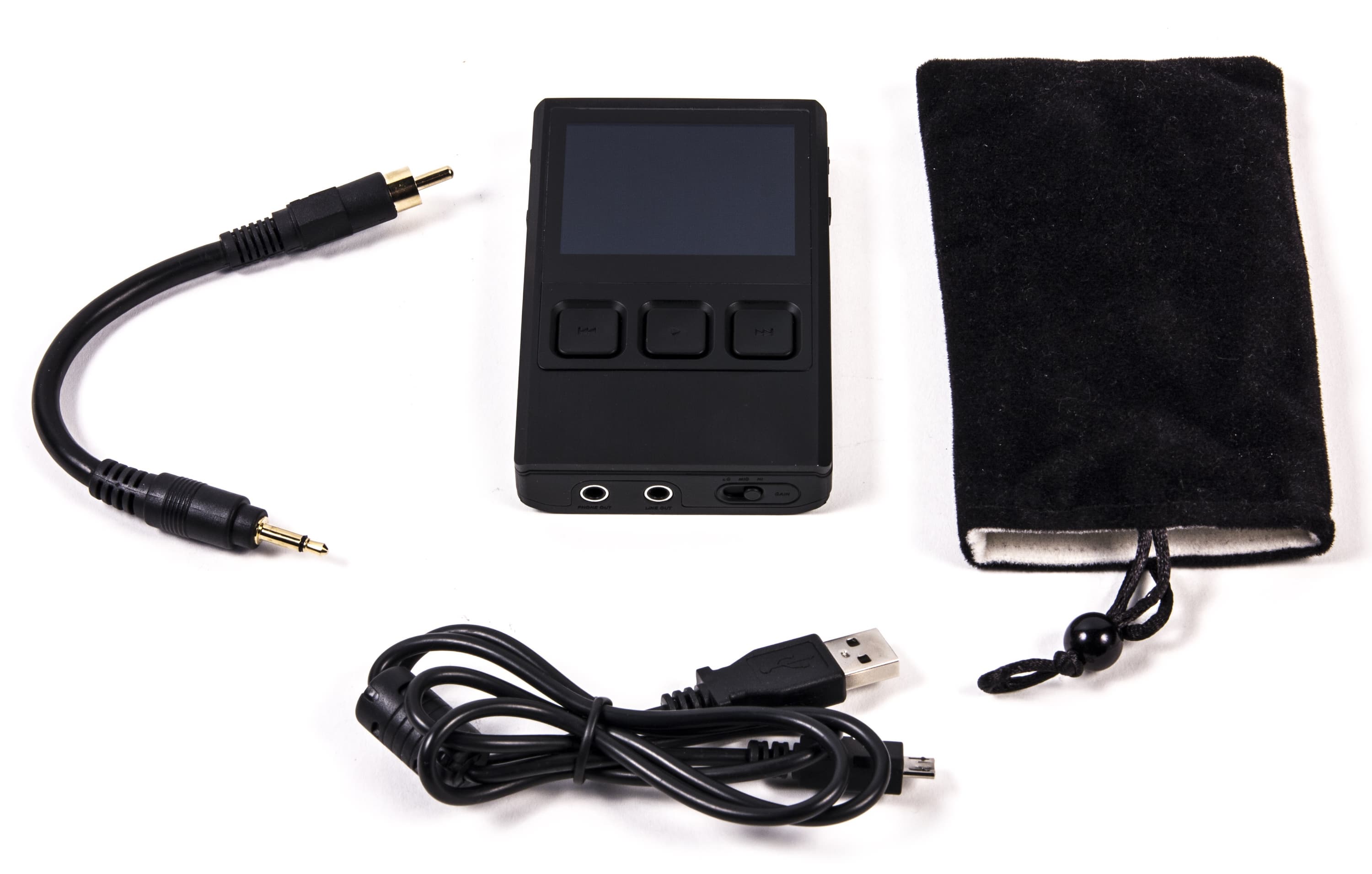 В строгой коробке, помимо плеера, мы обнаружили мягкий чехол, кабель Micro-USB, а также короткий кабель c RCA на одном конце и моно-TRS (3,5 мм) на другом.