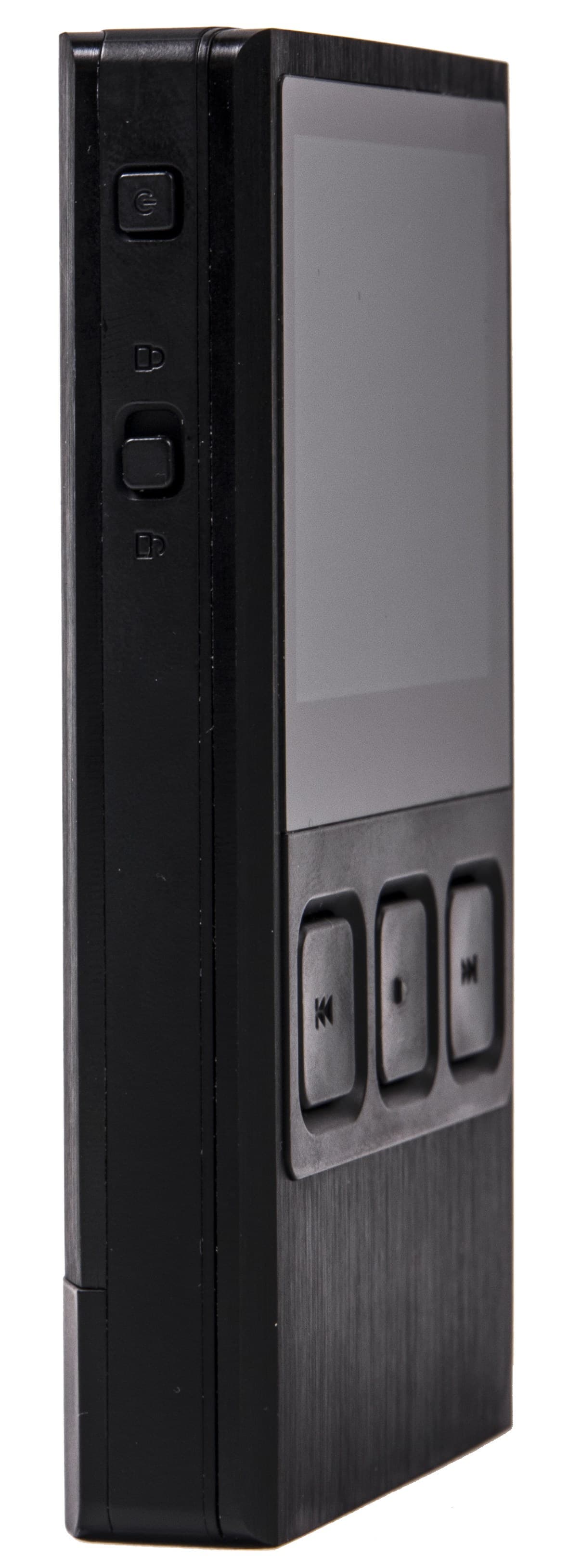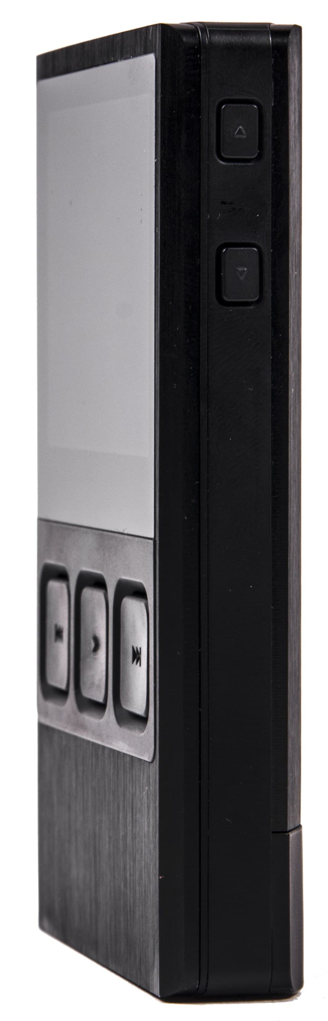 Опишем его подробнее. Фронтальная панель сделана из металла, симпатично текстурированного частыми вертикальными насечками. Примерно треть панели занимает сенсорный IPS-дисплей с широкими полями. Под ним в пластиковой вставке размещены три крупные квадратные кнопки — Previous, Play и Next. Они имеют короткий, но четкий ход.