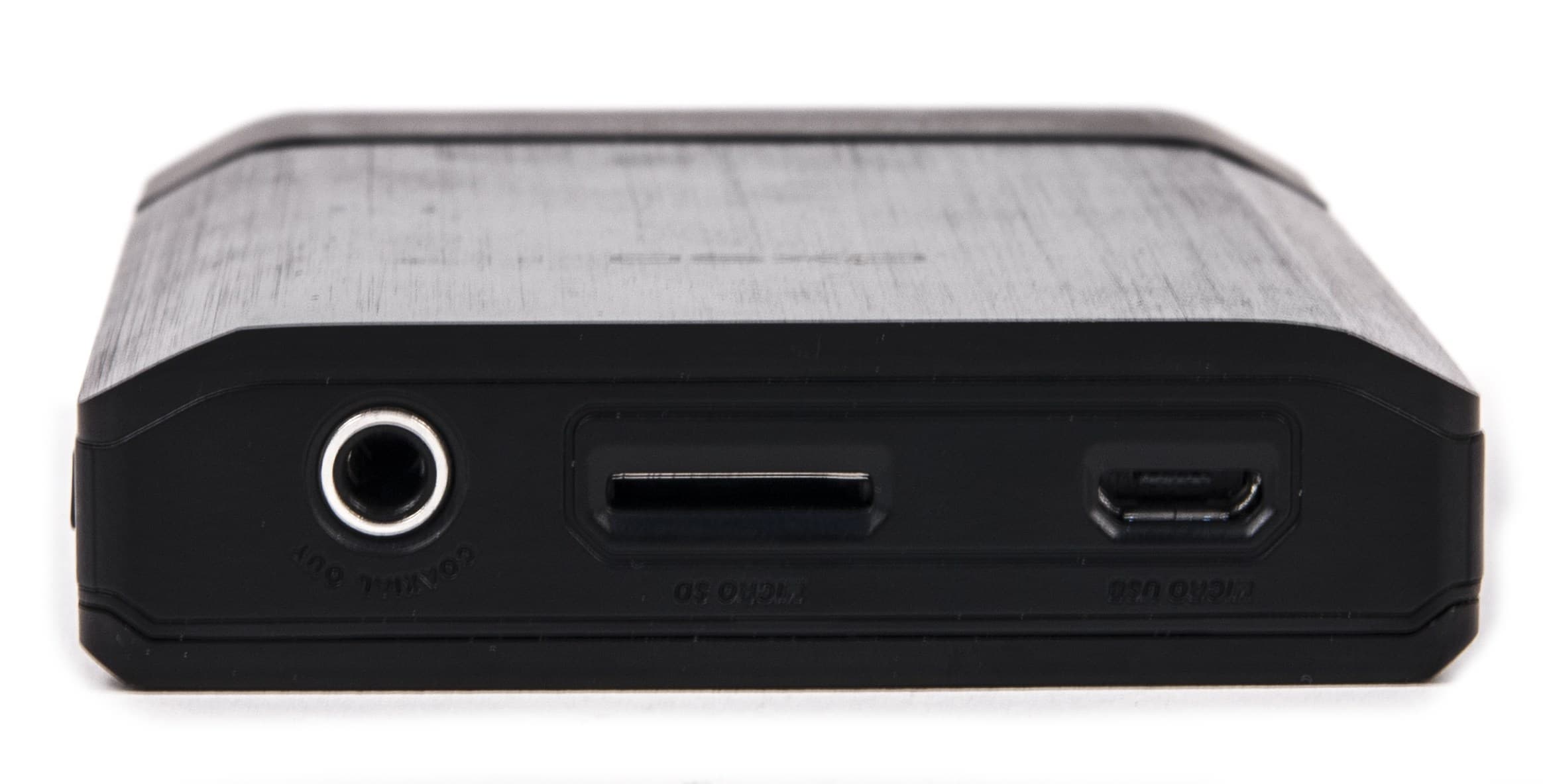 Ребра корпуса плеера выполнены из пластика. Сверху расположен выход RCA, подпружиненный слот для microSD и разъем OTG.