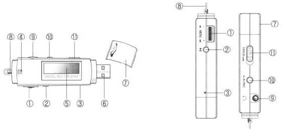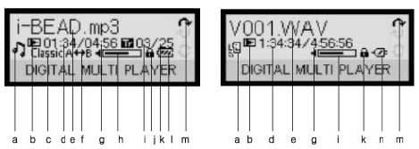 В руководстве пользователя имеются хорошие схемы ЖК-экрана плейдрайва в режимах плеера и диктофона, которую я и приведу.