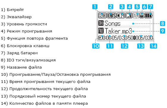 Самый обыкновенный монохромный LCD дисплей, стандартного разрешения 128 х 64 точки. Индикаторы расположены, на мой взгляд, очень удобно и компактно, увеличивая информативность небольшого по размерам экрана плеера. Более точная схема расположения индикаторов в стандартном режиме работы плеера приведена на картинке: