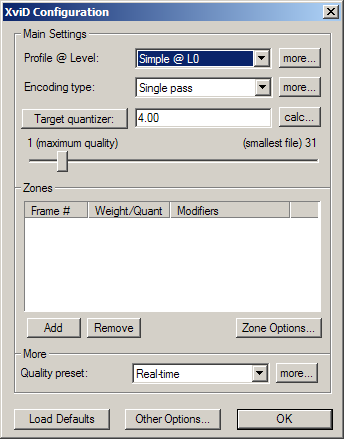 Подробные настройки кодека XviD: