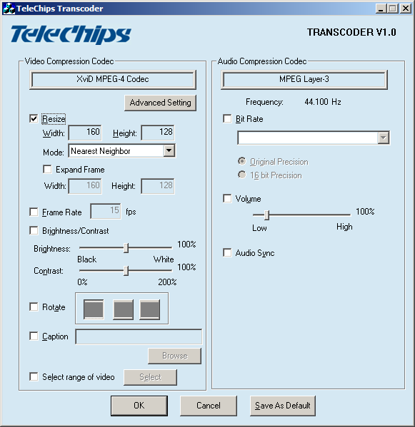 Имеются достаточно обширные настройки кодирования, но нам понадобятся только Resize (под разрешение экрана 160×128) и Frame Rate (не более 25):