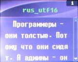 Как и большинство современных топовых плееров, наш герой умеет показывать текстовые файлы в формате TXT. Имеются 4 строчки, на которых помещается совсем немного информации за раз, но зато шрифт вполне читабелен и разборчив. Имеется поддержка русского языка в кодировках UTF16 и CP1251 (для просмотра этой кодировки, как и в случае тэгов, понадобится выставить в настройках интерфейса русский язык). Положение в тексте сохраняется как при закрытии файла, так и при отключении устройства. Возможен одновременный просмотр текста и прослушивание музыки, а поддержка больших по объему текстовых файлов даже делает возможным чтение книг, хотя для этой цели лучше все-таки обзавестись полноценным КПК.