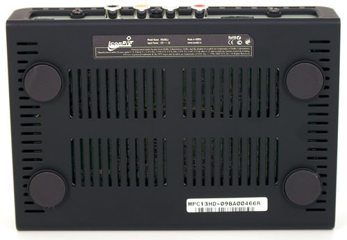 Обе боковые стенки плеера испещрены вентиляционными прорезями, а задняя панель полностью занята разъёмами: вход питания, выход HDMI 1.3, коаксиальный S/PDIF, композитный видеовыход, аналоговый аудио стерео выход, разъём RJ45 для подключения кабеля LAN, и, наконец, второй порт USB (первый расположен, как мы помним, на лицевой панели). Здесь же имеется ещё и разъём для подключения внешнего ИК-приёмника, подобного тому, которые обычно прилагаются к ТВ-тюнерам.