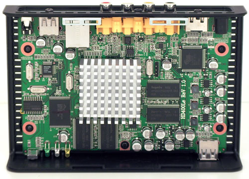 Столь компактный размер плеера заставил разработчиков хорошенько потрудиться над размещением на небольшой площади платы всех необходимых электронных компонентов. Главный чип здесь используется тот же самый, что и в плеере IconBiT HD400DVD — Sigma Designs 8634 SoC. И так же, как в старшей модели, этот чип закрыт высоким радиатором, способствующим рассеянию вырабатываемого тепла.