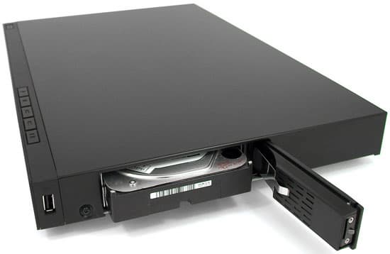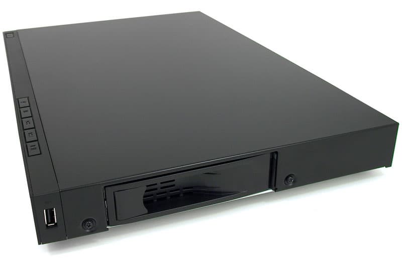Правая сторона металлической крышки имеет прорезь для доступа к корзине, в которую монтируется 3,5-дюймовый жёсткий диск SATA. Вставляется он мгновенно (так же и вынимается), но делать это нужно, разумеется, при обесточенном устройстве.