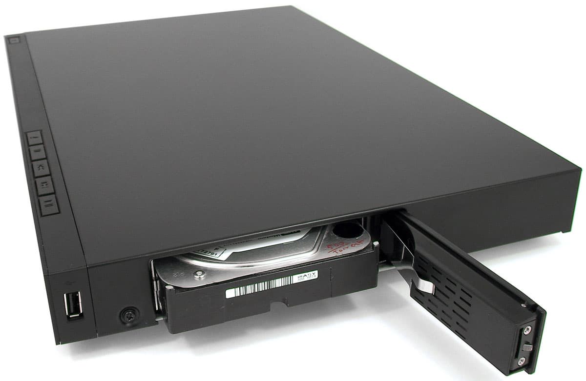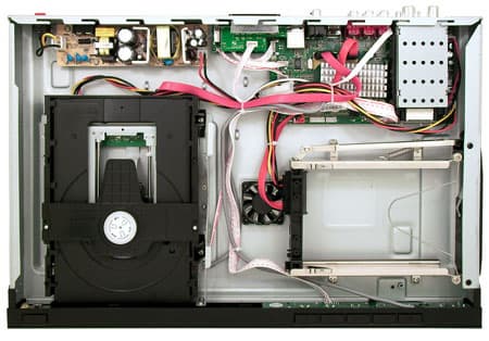 Внутреннее устройство показывает, что основное пространство медиаплеера занимают DVD-привод и корзина с жёстким диском. Вся электроника, включая и встроенный блок питания, занимает лишь небольшую часть объёма корпуса.