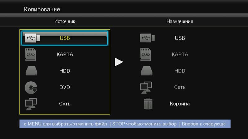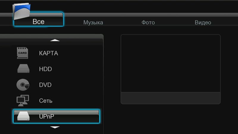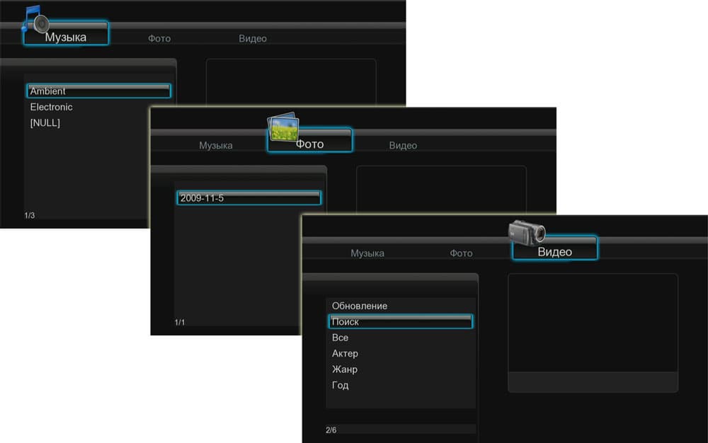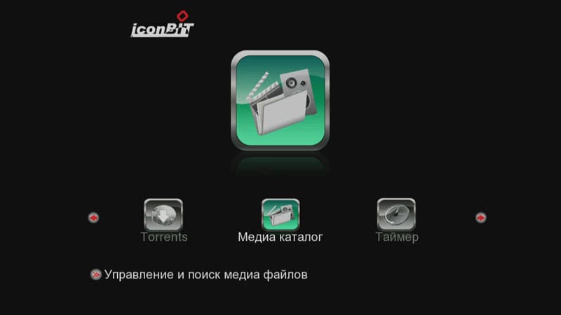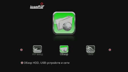 Следующая иконка — Обзор. Это стандартный для плееров Iconbit браузер, благодаря которому пользователь имеет возможность найти любую медиаинформацию со всех доступных локальных источников: карта памяти, жёсткий диск, DVD-диск, локальная сеть, UPnP и плей-листы, заранее созданные с помощью плеера.