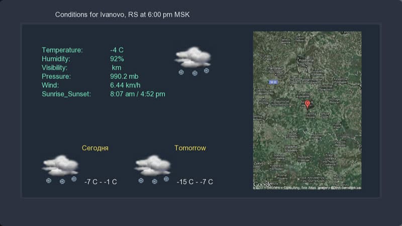 | Прогноз погоды сопровождается картой GooleMap с указанием расположения выбранного населённого пункта | |