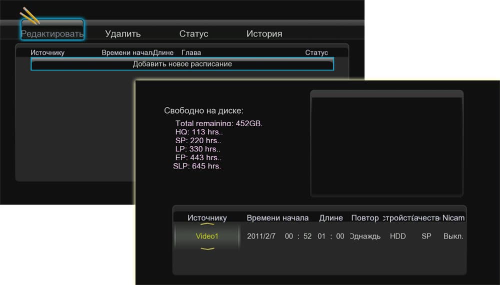 Данный сервис стандартен для всех устройств, умеющих записывать видео с внешних источников. Так, при наличии цифрового телевидения аппарат можно запрограммировать на запись в любое время и любой день. Он не подведёт — самостоятельно включится, запишет положенное время и выключится. Лишь бы выключатель на задней панели не был в положении Off :)