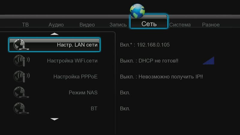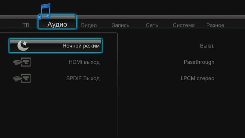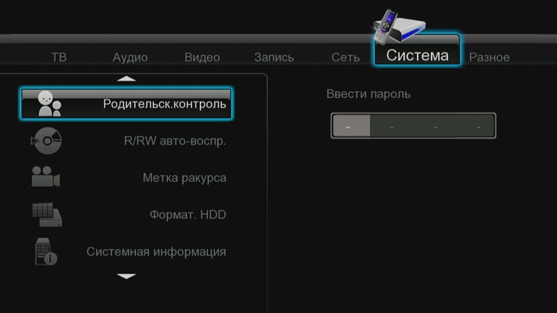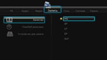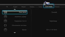 Настройки видеозаписи, доступны пять режимов: HQ, SP, LP, EP, SLP. Здесь же активируется функция TimeShift и выбирается устройство записи по умолчанию: HDD, USB, карта памяти | Сетевые настройки содержат изменяемые параметры LAN, WiFi (при использовании USB-WiFi-адаптера), PPPoE (для прямого соединения с провайдером, использующим данный тип соединения). Здесь же включается/отключается режим NAS (сетевого хранилища), а также запускается/останавливается торрент-клиент | В системных настройках можно изменить текущую дату/время, кодировку текста (полезно при работе с интернет-сервисами)… |