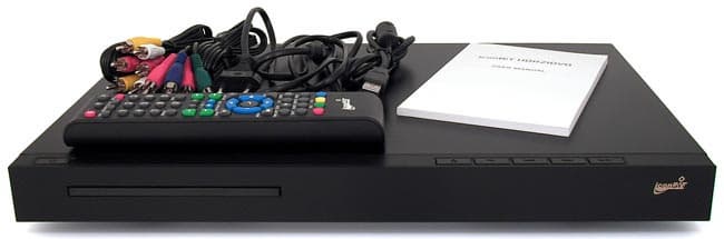 В комплекте с аппаратом имеется инструкция, инфракрасный пульт управления, композитный и компонентный кабели, USB-кабель для подключения плеера к ПК и кабель питания. Как видим, внешний блок питания отсутствует — у аппарата он встроенный.