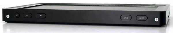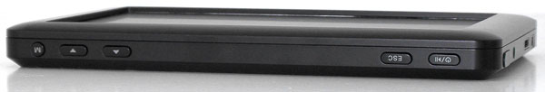Изучим вначале дизайн меньшего, 605-го, плеера. На левой грани его корпуса расположены: ползунок для блокирования клавиш от случайного нажатия, вход для блока питания, выход HDMI 1.3 и порт mini-USB для подключения плеера к ПК. Но не только к ПК! Данный порт играет также роль интерфейса USB-Host, к которому, с помощью прилагаемого USB-переходника, можно подключить какой-либо внешний USB-накопитель. В левом нижнем углу корпуса имеется ушко для продевания ремешка.