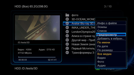 Плеер умеет преобразовывать обычный 2D-контент в 3D, но результат такого преобразования, конечно же, совсем не напоминает настоящую стереосъемку. Для просмотра 3D-видео, запакованного в стереопару (горизонтальную или вертикальную), требуется вручную активировать переключение режим 3D и указывать плееру тип воспроизводимого контента (впрочем, то же самое можно сделать и средствами любого 3D-телевизора).