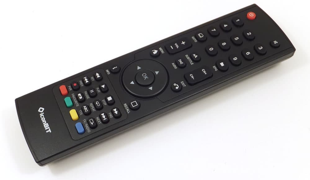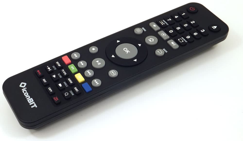 Прилагаемый пульт дистанционного управления отличается от прежнего тем, что здесь изменены функции двух кнопок, находящихся в самом нижнем ряду. Если в плеере без тюнера этими кнопками запускается браузер и сортируется контент, то в рассматриваемом плеере эти кнопки запускают/останавливают запись трансляции и включают/выключают режим TimeShift. Есть и ещё два дополнения: на двух разноцветных кнопках появились надписи, говорящие о том, что зелёная кнопка предназначена для активации EPG (электронный телегид), а жёлтой кнопкой включается и выключается режим телетекста.