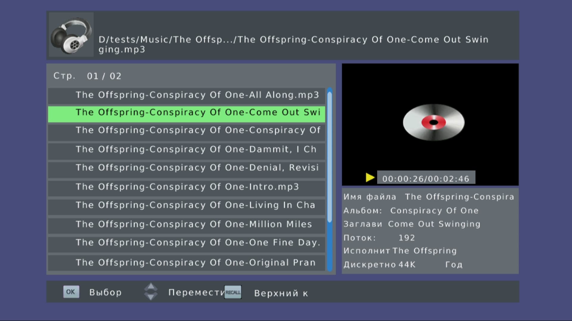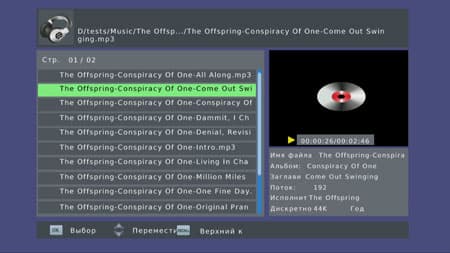 Тем же порядком не следует надеяться, что с приобретением данной приставки вы получите полноценный аудиоплеер для вашего ресивера. Воспроизведение приставкой аудиофайлов ограничивается лишь несколькими распространёнными форматами: MP3, WAV, WMA. Других имеющихся у нас аудиозаписей таких форматов, как OGG, APE, FLAC или DTS, приставка попросту не увидела, не отобразила в своём браузере. Во время проигрывания аудио на экране отображается плей-лист, а также краткая информация о текущем файле.