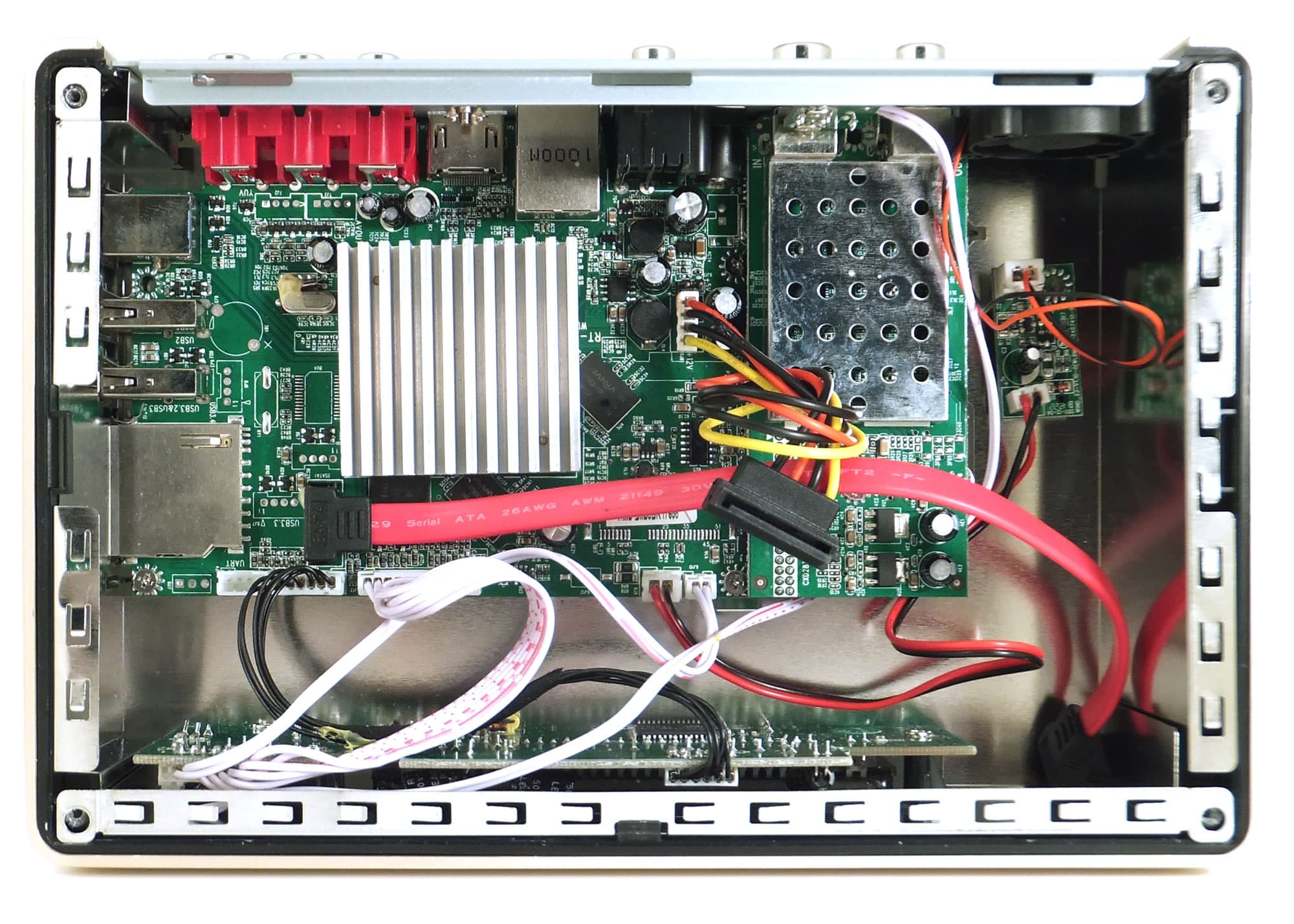 В дне плеера имеются вентиляционные отверстия, такие же, как и на крышке. Здесь же можно видеть, как серьёзно защищён аппарат от разборки. Чтобы добраться до внутренностей плеера, требуется снять металлическую П-образную крышку, но отвинтить четыре болта на торце — этого недостаточно. Помимо болтов, крышка удерживается передней пластиковой панелью, которая также привинчена к корпусу болтами, но чтобы добраться до них, потребуется отклеить глянцевую накладку на лицевой панели. Но и это ещё не всё. Крышка фиксируется четырьмя загнутыми полукруглыми лепестками — они хорошо видны на фотографии.