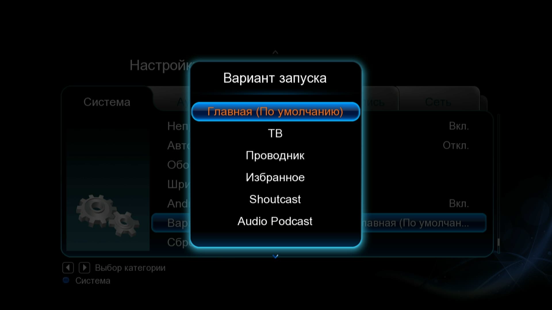 Для удобства пользователя в настройках имеется опция, позволяющая указывать, какое из многочисленных приложений плеера должно запуститься при включении аппарата. На выбор имеется несколько пунктов: Главное меню, ТВ, Проводник, Избранное, ShoutCast (интернет-радио), Audio Podcast, Videoподкаст и Youtube-XL (интернет-сервисы).