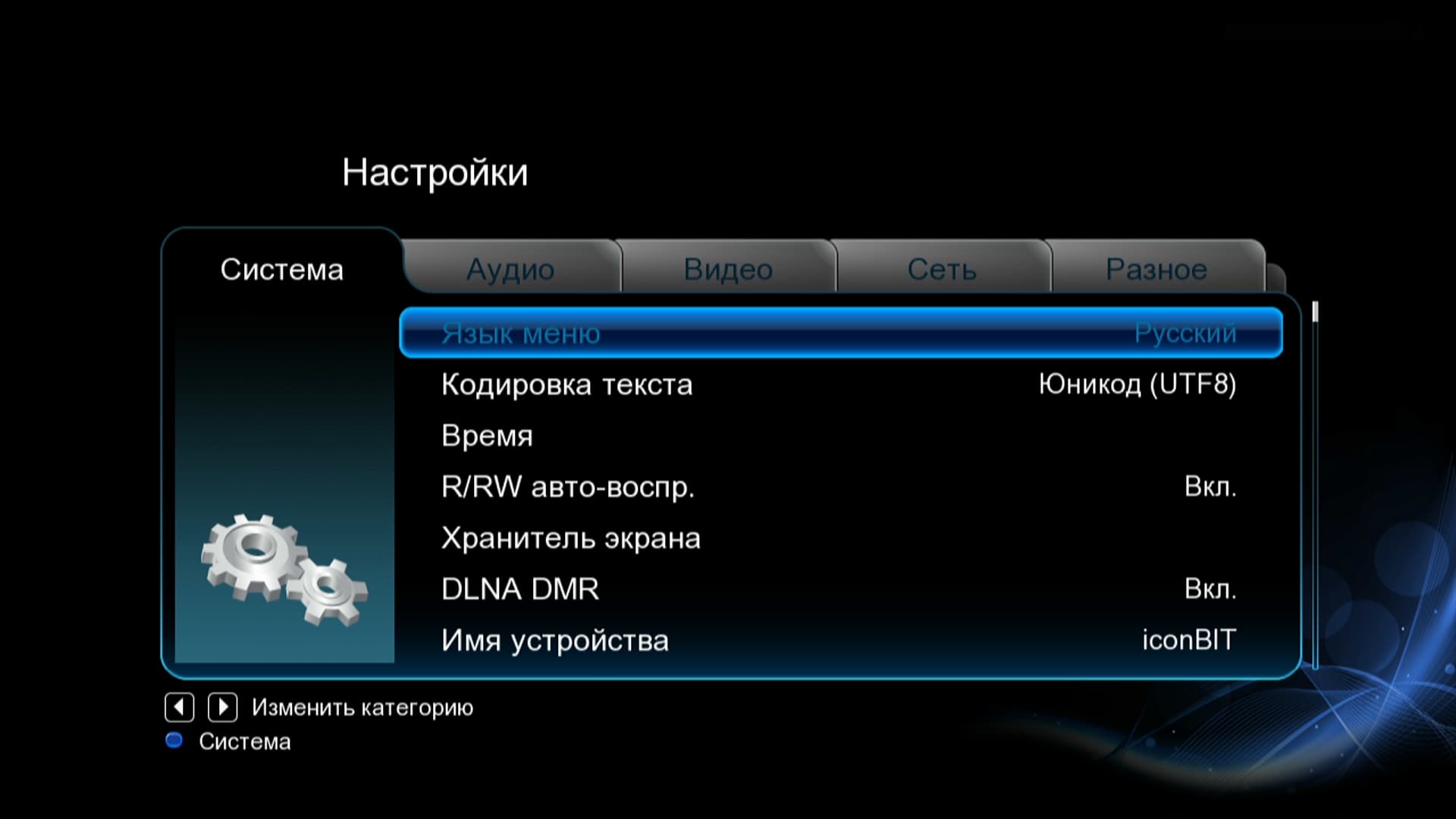 Но достаточно зацикливаться на сетевых скоростях, ведь, в конце концов, рассматриваемый аппарат рассчитан на установку жёсткого диска, являющегося основным хранилищем медийного контента. Перейдём наконец-то к функциям, заложенным в наш плеер. Напомним: главное меню системы состоит из девяти пунктов, один из них мы уже рассмотрели — это настройки. Теперь обратимся к пунктам, которые интересуют обыкновенного пользователя, желающего включить плеер и начать просмотр имеющегося на диске материала.