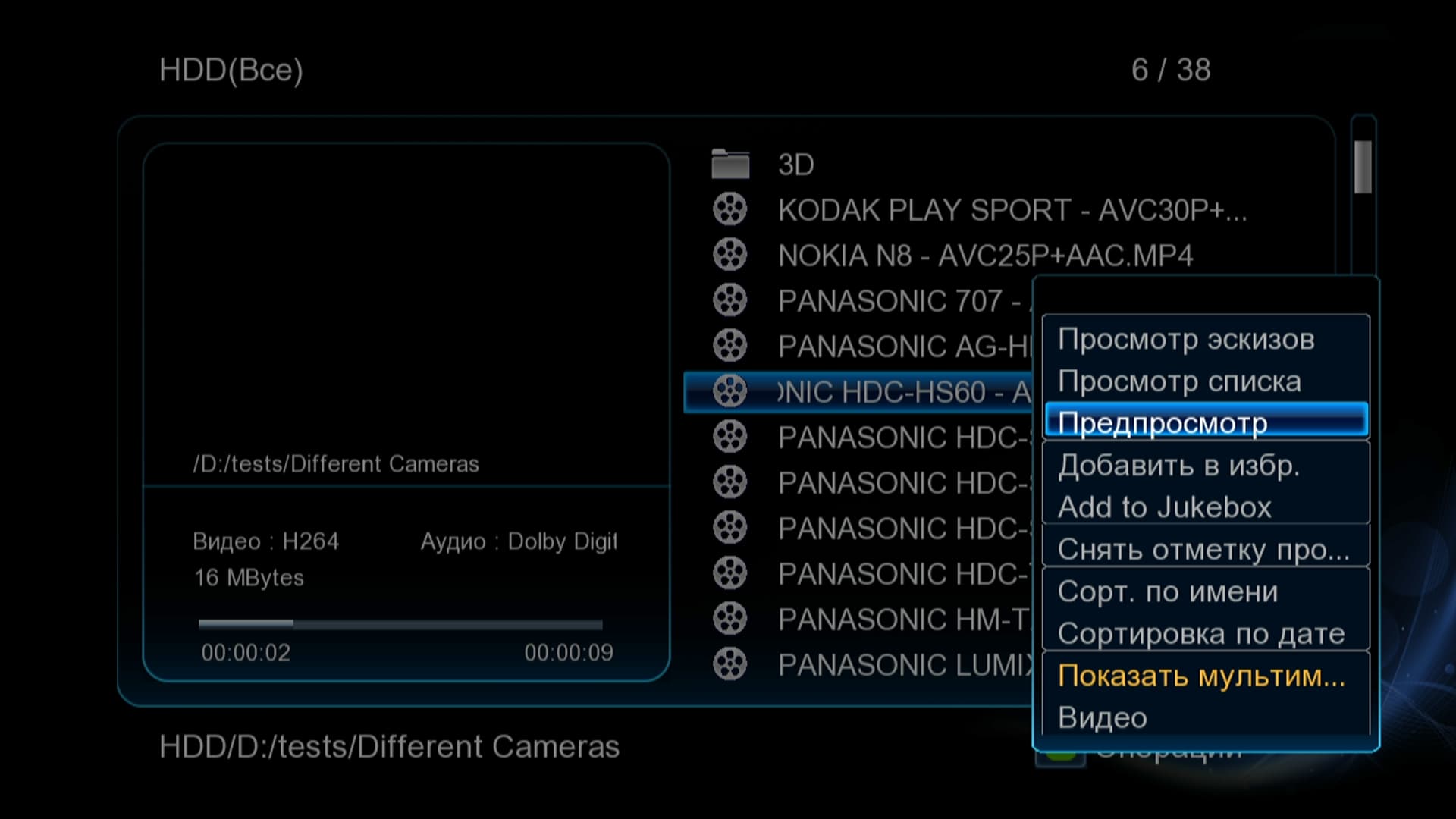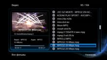 Пора перейти к просмотру этого проиндексированного содержимого. Видеоплеер работает со всеми известными и распространёнными видеоформатами, от абсолютно любых видеокамерных MTS и MP4 до сугубо «интернетных» Flash и RealMedia. Это же касается и всех возможных профилей (profiles), с которыми кодируется видео в нынешний H.264 — плеер беспрекословно воспроизводит любой, от main до нигде пока не используемого high@L5.1. Но есть среди форматов несколько исключений. Речь о «сыром», несжатом видео, либо DV AVI, которые не могут быть воспроизведены ни одним медиаплеером: данные форматы предназначены исключительно для последующей обработки, но не просмотра. Из аудиоформатов плеером поддерживаются и столь обожаемые меломанами lossless: Monkey's APE вместе со списками CUE и FLAC с их CUE-плей-листами.